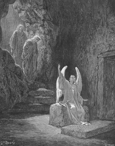 새벽에 몇몇 여인들이 예수님의 무덤에 갔으나 무덤은 비어 있었습니다. 천사는 여인들에게 예수님이 부활하셨음을 전했습니다. 부활하신 예수님은 막달라 마리아에게 먼저 나타나셨고, 엠마오로 가던 두 제자와도 동행하셨습니다. 이후 예수님은 제자들에게 나타나셔서 부활을 확증하시고 평강을 전하셨습니다(마태복음 28:1-10, 누가복음 24:13-49, 요한복음 20:1-29).